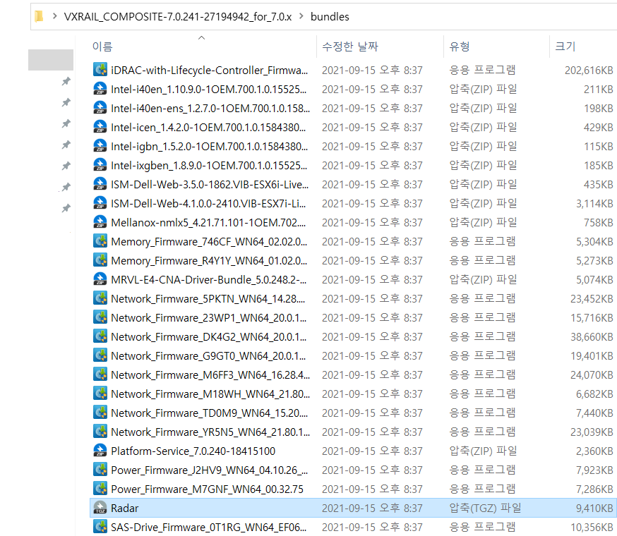 2. upgrade bundle에서 "Radar.tgz" 파일의 압축을 풀고 VxRail Manager 경로 "/home/mystic/"에 파일을 업로드