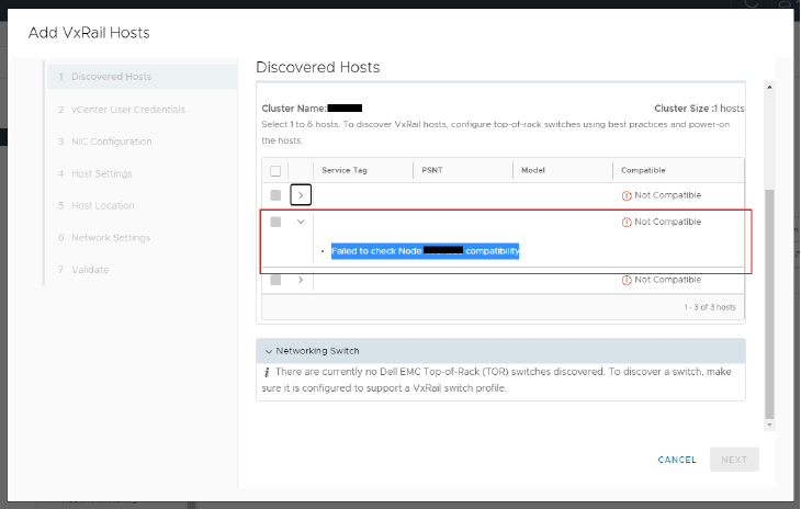 VxRail 플러그인 UI 기능을 통해 VxRail 호스트를 추가, 하지만 사전 검사가 노드 호환성을 확인하지 못하는 issue 발생