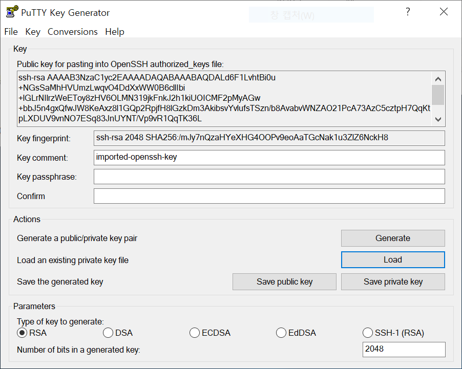- Load 로 key.pem파일 지정 > Save Private Key를 눌러서 ppk파일 이름 지정