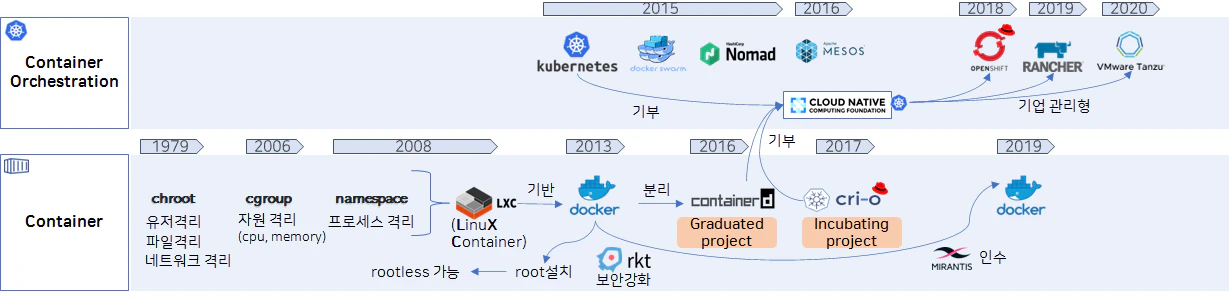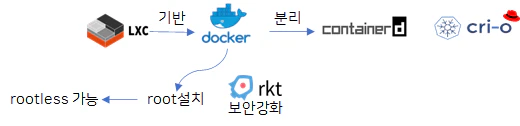 이후 Docker가 탄생하면서 누구나 쉽게 컨테이너 환경을 띄울 수 있게 되었습니다. 초기 Docker는 root 권한으로 설치&실행을 했어야 했기에 보안에 취약한 면이 있었고, 보안과 성능을 강조한 rkt(rocket) 이라는 컨테이너가 나왔습니다. 현재는 rootless 설치모드가 생겨서 Docker에 대한 보안이 강화되었습니다.