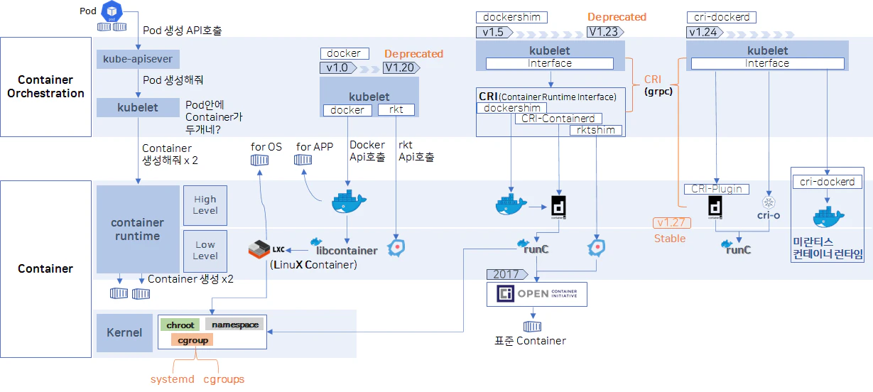 CRI와 더불어 컨테이너의 기술발전과 종류가 증가함에 따라 컨테이너 런타임에 대한 표준화를 위해 Open Container Initiative(OCI)가 생겨났고, OCI스펙에 맞춰서 구현된 컨테이너 런타임을 별도의 CRI 구현 없이 OCI를 지원하는 CRI구현체에 의해 관리가 가능해지게 되었습니다.