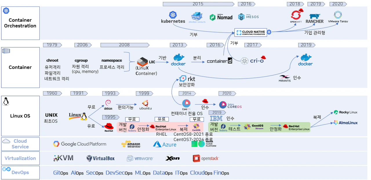 Kubernetes는 DevOps와 Container Infra 환경에서 빼놓을 수 없는 부분이 되었습니다. 쿠버네티스를 잘 이해하기 위해서는 OS의 기술발전과 더불어 가상화 및 컨테이너 환경에 대한 전반적인 배경 흐름을 알 필요가 있습니다.
